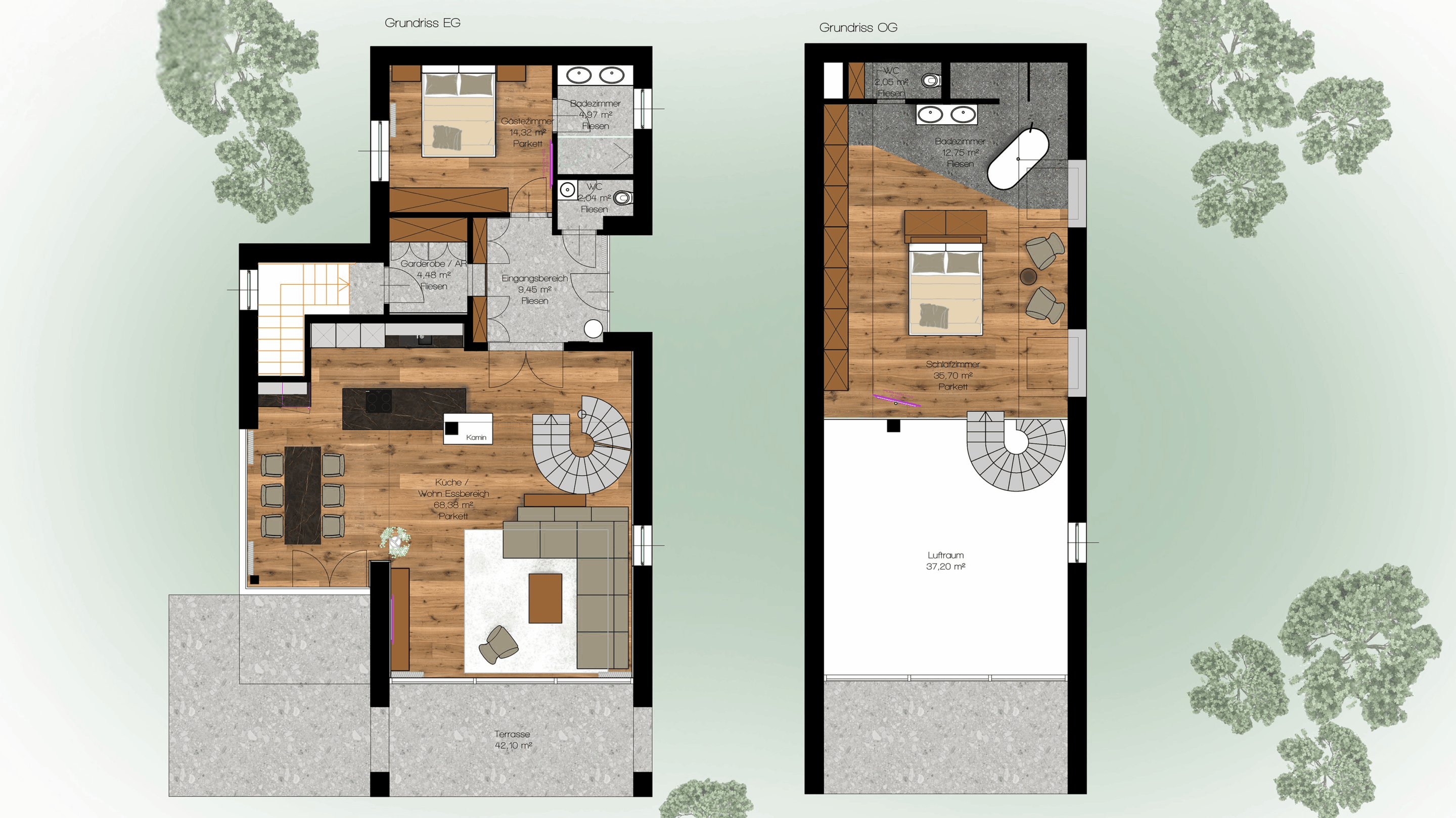 Bei allen drei Wohneinheiten wurden Komfort und Funktionalität groß geschrieben. So mussten dank intelligenter Raumaufteilung nicht auf Features wie Hauswirtschaftsraum, Schrankraum oder Speisekammer verzichtet werden. Die GRIFFNER Architekten haben es möglich gemacht: Die Kombination von vollem Raumgefühl bei gleichzeitig 100%iger Funktionalität und 100%iger Qualität. Jede Hauseinheit verfügt über ein eigenes Carport und eine eigene Terrasse samt Garten.
